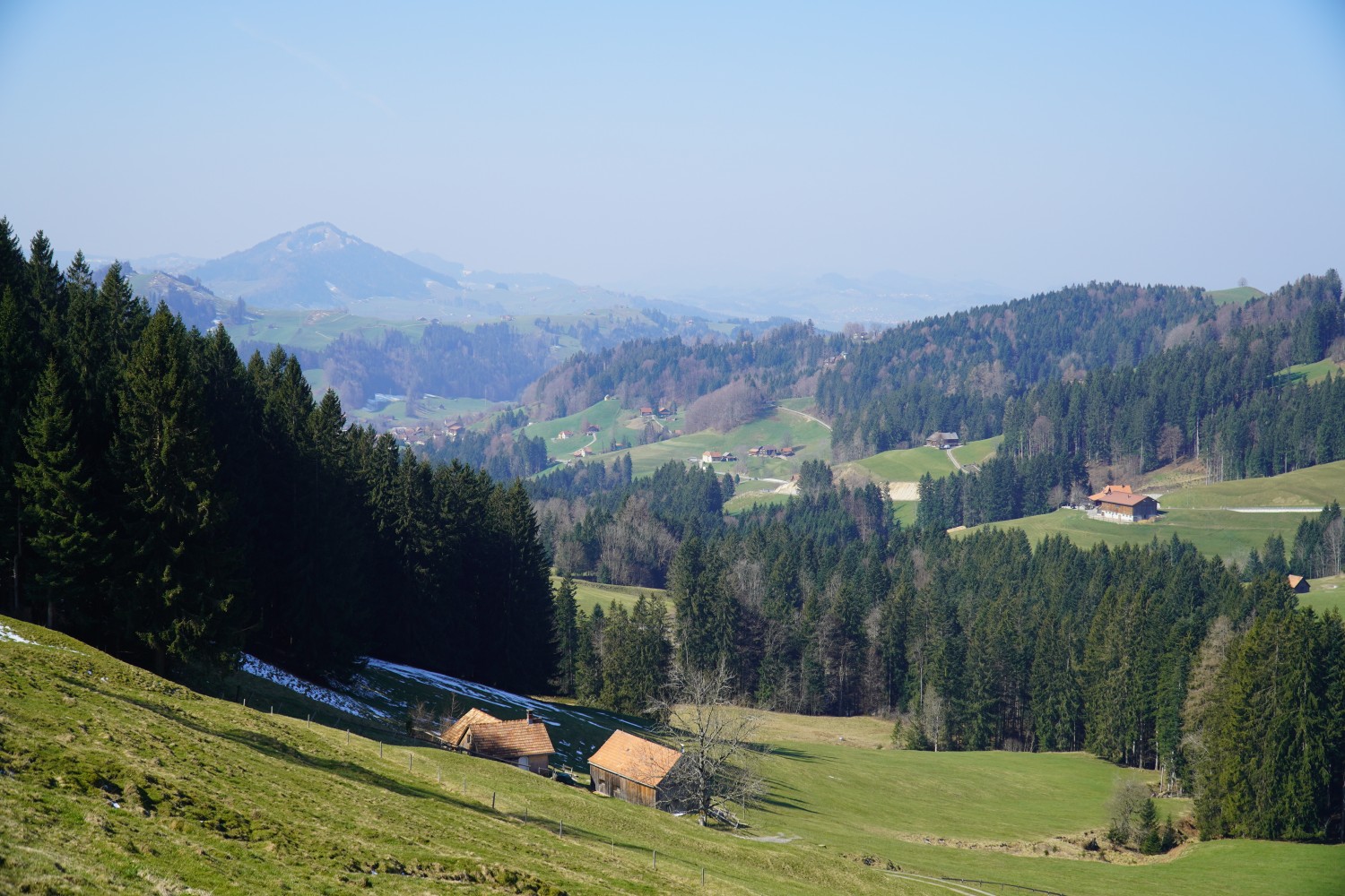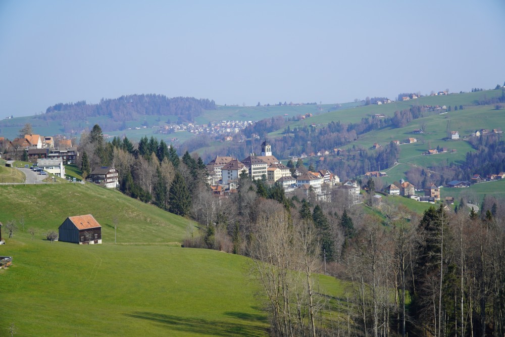 Etappe 2: Wir steigen im Kaien aus dem Postauto und nehmen das Strässchen das über die Nase zum Restaurant Sonne führt. Unterhalb von Wald führt die Route über Wiesen in Richtung Rechberg und dann hinuter dem idyllischen Moosbach. Beim Zusammenfluss mit der Goldach wenden wir uns links hoch nach Trogen, dem alten Hauptort von Appenzell Ausserrhoden mit dem historischen Landsgemeindeplatz. Nach der Erkundung der Geschichte geht es hinauf in Richtung Gäbris, über Pestalozzi-Dorf, Sand, Nistelbüel und am Windrad auf dem Chürstein vorbei. Oben auf dem Gäbris bewundern wir die fantastische Aussicht über das Land und in den Alpstein und wandern der Krete entlang in Richtung Gais. In Obergais müssen wir uns entscheiden – wenn wir die Route gleich weiterwandern wollen, wenden wir uns nach rechts auf die dritte Etappen, wenn wir unterbrechen wollen, steigen wir links nach Gais hinunter.
