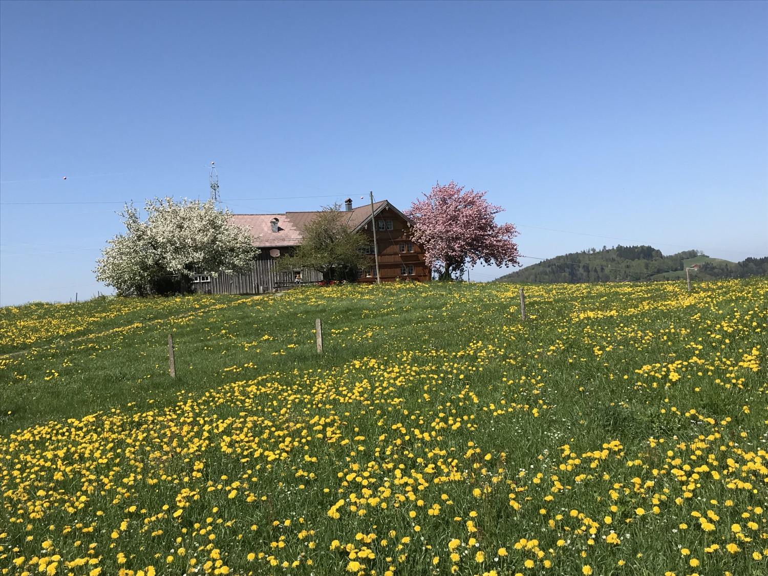 Etappe 3: Wenn wir die Wanderung in Gais unterbrochen haben, steigen wir nach Obergais hinauf. Ansonsten biegen wir in Obergais rechts ab hinunter zur Kriegersmühle. Auf der anderen Seite des Wissbachs geht es wieder hinauf und wir überqueren den nächsten Hügelzug bei der Bühlerer Wissegg und hinunter nach Wette zum historischen „Pfauen“, ein altes Gasthaus, das heute ein Wohnhaus ist. Dafür können wir uns nach dem nächsten Aufstieg zur Waldegg im Gasthaus stärken. Nun geht es entlang dem Eggen-Höhenweg aussichtsreich über Kunzenegg und Fröhlichsegg hinunter nach Niederteufen zur Station der Appenzeller Bahnen.